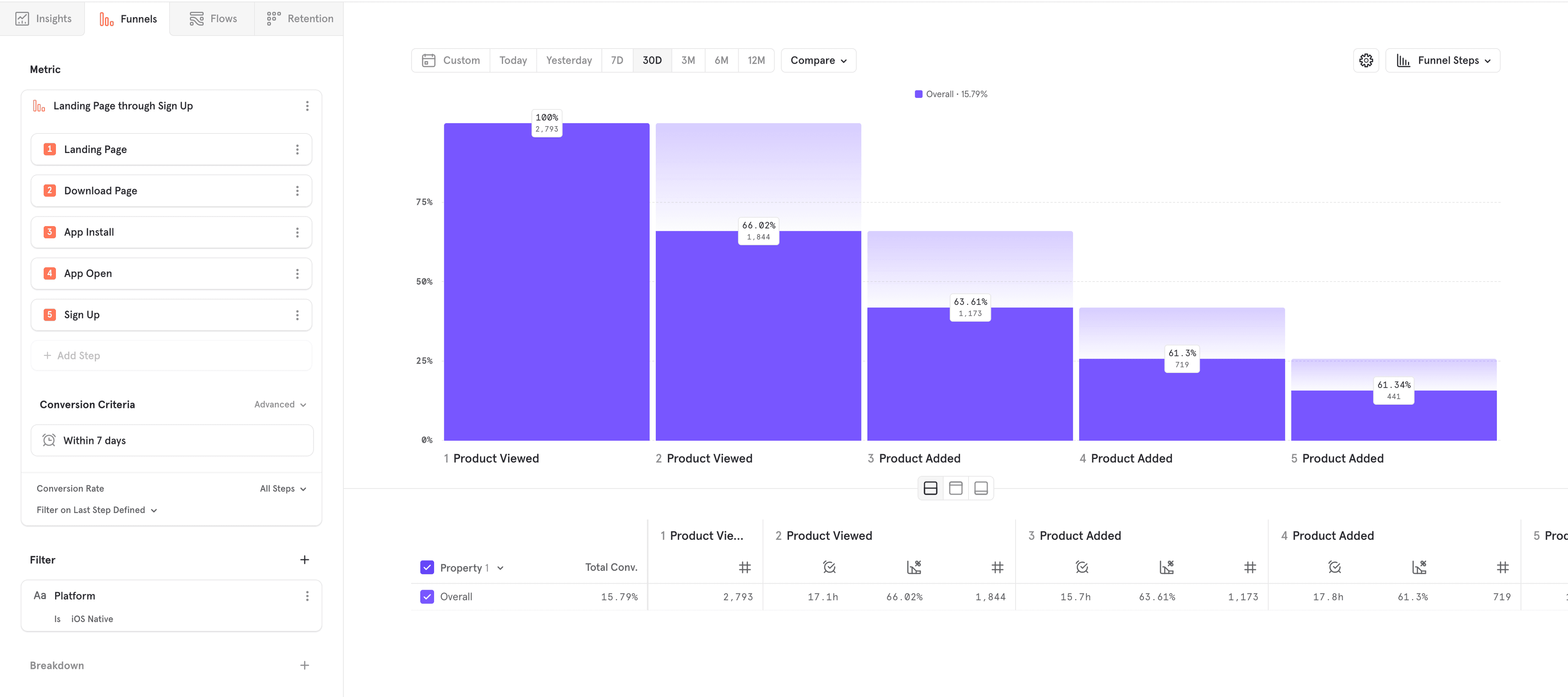 For example, let’s say your signup flow contains five steps. Within the funnel definition, you can add one event for each step, in the following order: “Landing Page” → “Download Page” → “App Install” → “App Open” → “Sign Up.” At this point, your query should look like this.